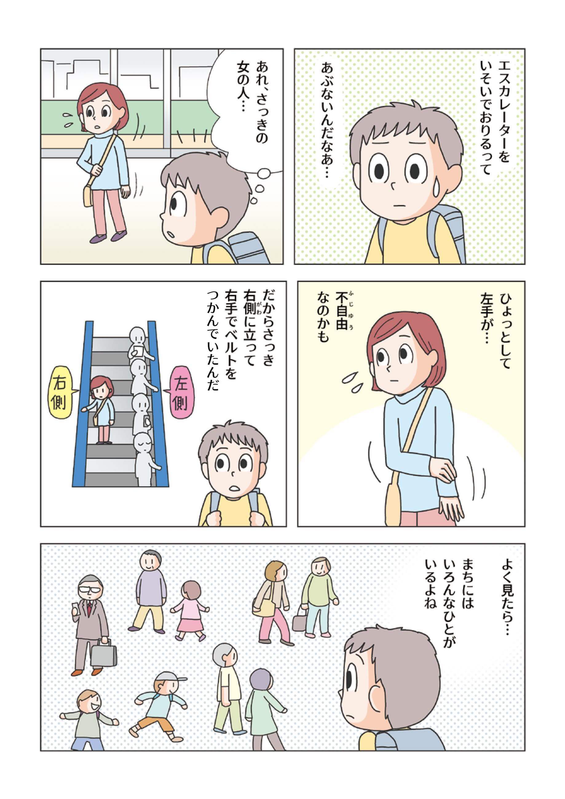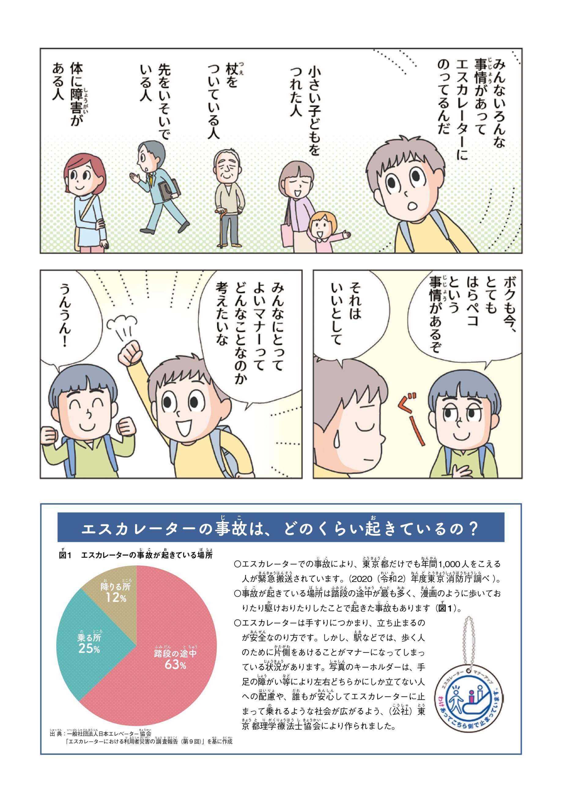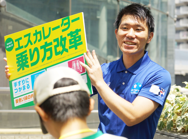 「東京都理学療法士協会」という団体があってね、障がいを持つ人もそうでない人も安心して暮らせる街づくりを目指して、エスカレーターの利用方法についてみんなにお知らせする活動を行っているんだって!