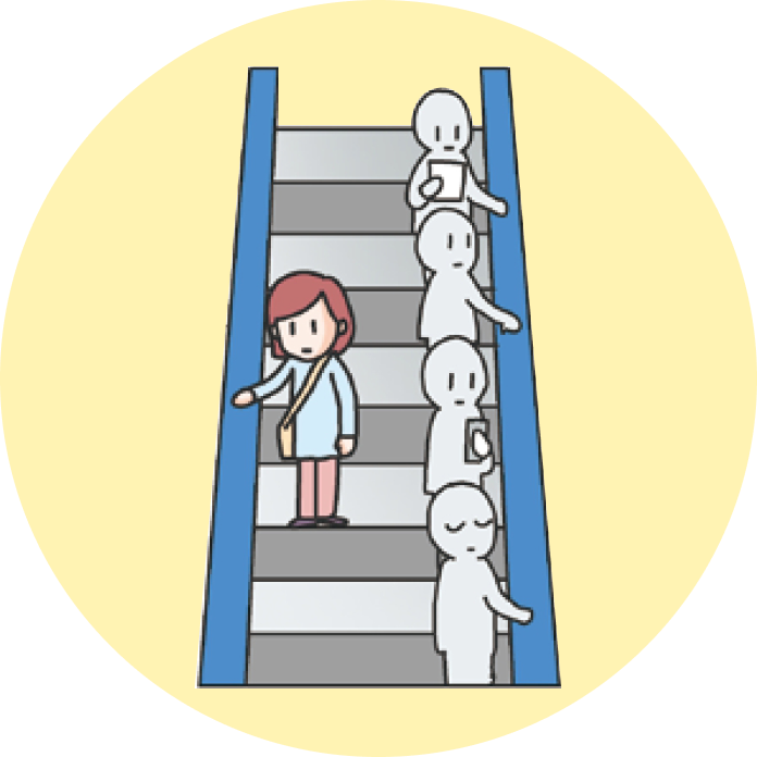 エスカレーターに乗る時は必ず手すりにつかまって、歩かず立ち止まろう。
